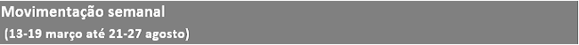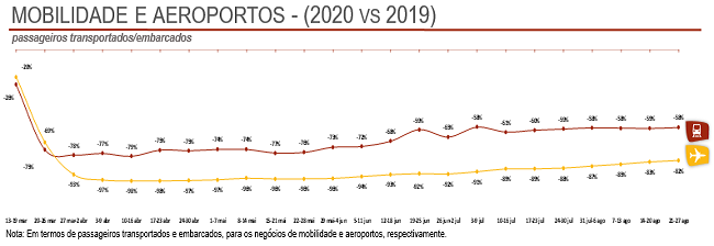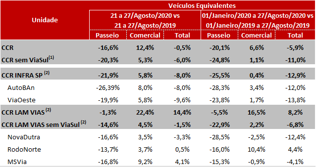 A CCR S.A. (“CCR” ou “Companhia”) (B3: CCRO3; Bloomberg: CCRO3BZ; Reuters: CCRO3.SA), em continuidade aos Fatos Relevantes divulgados nos dias 18/03/2020 e 21/03/2020, e diante da postura adotada pela Companhia em reportar semanalmente, em seu site, as informações sobre a movimentação nas concessões sob sua gestão, de forma agregada por Divisão (Infra SP, LAM Vias, Mobilidade e Aeroportos), comunica aos seus acionistas e ao mercado em geral, o resultado consolidado do levantamento referente ao tráfego das rodovias, na forma de veículos equivalentes, à mobilidade urbana, em termos de passageiros transportados, e aos aeroportos, em número de passageiros embarcados, tudo demonstrado através do boletim semanal do período compreendido entre os dias 21/08/2020 e 27/08/2020, conforme abaixo: