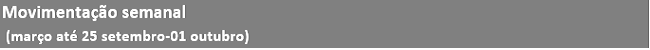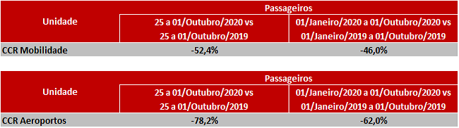 A CCR S.A. (“CCR” ou “Companhia”) (B3: CCRO3; Bloomberg: CCRO3BZ; Reuters: CCRO3.SA), em continuidade aos Fatos Relevantes divulgados nos dias 18/03/2020 e 21/03/2020, e diante da postura adotada pela Companhia em reportar semanalmente, em seu site, as informações sobre a movimentação nas concessões sob sua gestão, de forma agregada por Divisão (Infra SP, LAM Vias, Mobilidade e Aeroportos), comunica aos seus acionistas e ao mercado em geral, o resultado consolidado do levantamento referente ao tráfego das rodovias, na forma de veículos equivalentes, à mobilidade urbana, em termos de passageiros transportados, e aos aeroportos, em número de passageiros embarcados, tudo demonstrado através do boletim semanal do período compreendido entre os dias 25/09/2020 e 01/10/2020, conforme abaixo: