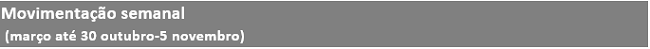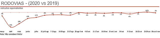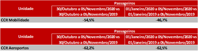 A CCR S.A. (“CCR” ou “Companhia”) (B3: CCRO3; Bloomberg: CCRO3BZ; Reuters: CCRO3.SA), em continuidade aos Fatos Relevantes divulgados nos dias 18/03/2020 e 21/03/2020, e diante da postura adotada pela Companhia em reportar semanalmente, em seu site, as informações sobre a movimentação nas concessões sob sua gestão, de forma agregada por Divisão (Infra SP, LAM Vias, Mobilidade e Aeroportos), comunica aos seus acionistas e ao mercado em geral, o resultado consolidado do levantamento referente ao tráfego das rodovias, na forma de veículos equivalentes, à mobilidade urbana, em termos de passageiros transportados, e aos aeroportos, em número de passageiros embarcados, tudo demonstrado através do boletim semanal do período compreendido entre os dias 30/10/2020 e 05/11/2020, conforme abaixo: