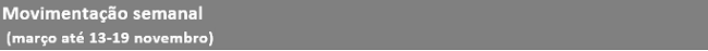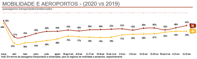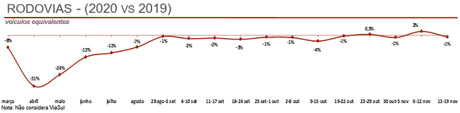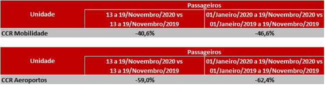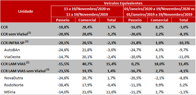 A CCR S.A. (“CCR” ou “Companhia”) (B3: CCRO3; Bloomberg: CCRO3BZ; Reuters: CCRO3.SA), em continuidade aos Fatos Relevantes divulgados nos dias 18/03/2020 e 21/03/2020, e diante da postura adotada pela Companhia em reportar semanalmente, em seu site, as informações sobre a movimentação nas concessões sob sua gestão, de forma agregada por Divisão (Infra SP, LAM Vias, Mobilidade e Aeroportos), comunica aos seus acionistas e ao mercado em geral, o resultado consolidado do levantamento referente ao tráfego das rodovias, na forma de veículos equivalentes, à mobilidade urbana, em termos de passageiros transportados, e aos aeroportos, em número de passageiros embarcados, tudo demonstrado através do boletim semanal do período compreendido entre os dias 13/11/2020 e 19/11/2020, conforme abaixo: