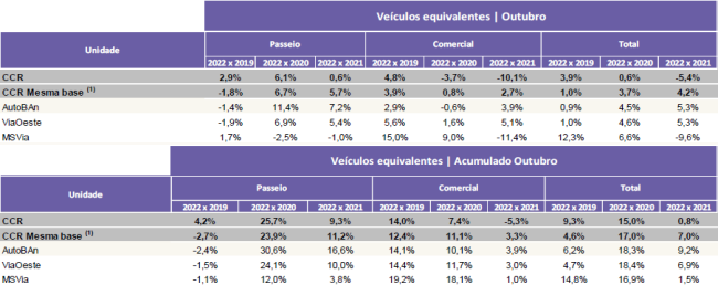 A CCR S.A. (“CCR” ou “Companhia”) (B3: CCRO3; Bloomberg: CCRO3BZ; Reuters: CCRO3.SA), em continuidade ao Comunicado ao Mercado de 02/12/2021, diante da postura adotada pela Companhia em reportar mensalmente, em seu site, as informações sobre a movimentação nas concessões sob sua gestão, comunica aos seus acionistas e ao mercado em geral, o resultado consolidado do levantamento referente ao tráfego das rodovias, na forma de veículos equivalentes, à mobilidade urbana, em termos de passageiros transportados, e aos aeroportos, em número de passageiros embarcados, tudo demonstrado através do boletim referente ao mês de Outubro, as comparações foram realizadas com os mesmos períodos dos anos de 2021, 2020 e 2019, conforme abaixo: Nota: O feriado do dia 12 de outubro (Nossa Sr.a Aparecida) caiu em uma: (i) quarta-feira em 2022; (ii) terça-feira em 2021; (iii) segunda-feira em 2020 e (iv) em um sábado em 2019. Comparações entre 2022 e 2021, 2020 e 2019: Comparações entre 2022 e 2021, 2020 e 2019: