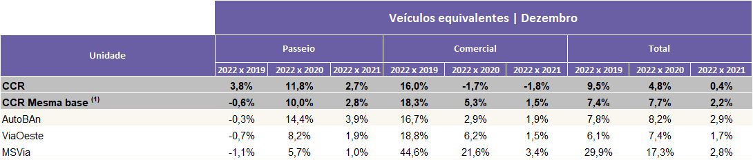 - Para comparabilidade dos dados, foram realizados ajustes na mesma base, excluindo dos períodos confrontados os seguintes efeitos: (i) ViaSul: início de cobrança em 15 de fevereiro de 2019 (P2 e P3) e 9 de fevereiro de 2020 nas demais praças (P1, P4, P5, P6 e P7), (ii) ViaCosteira: Início das operações em 02/05/2021. (iii) RodoNorte: Encerramento do prazo de vigência do contrato em 27/11/2021. (iv) NovaDutra: Encerramento do prazo de vigência do contrato em 28/02/2022. (v) RioSP: Início das operações em 01/03/2022.