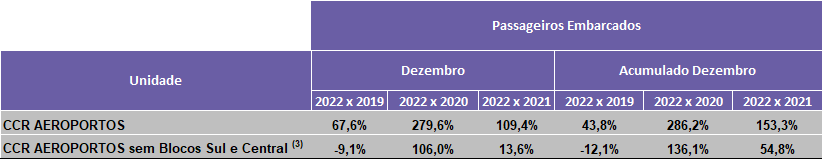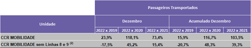 A CCR S.A. (“CCR” ou “Companhia”) (B3: CCRO3; Bloomberg: CCRO3BZ; Reuters: CCRO3.SA), em continuidade ao Comunicado ao Mercado de 02/12/2021, diante da postura adotada pela Companhia em reportar mensalmente, em seu site, as informações sobre a movimentação nas concessões sob sua gestão, comunica aos seus acionistas e ao mercado em geral, o resultado consolidado do levantamento referente ao tráfego das rodovias, na forma de veículos equivalentes, à mobilidade urbana, em termos de passageiros transportados, e aos aeroportos, em número de passageiros embarcados, tudo demonstrado através do boletim referente ao mês de Dezembro, as comparações foram realizadas com os mesmos períodos dos anos de 2021, 2020 e 2019, conforme abaixo: